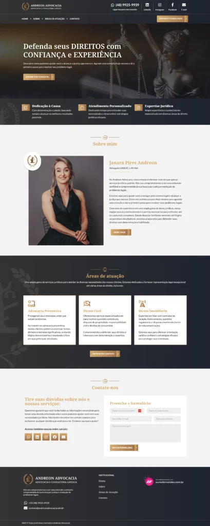 Página criada para a Dra. Janara Andreon. O intuito principal foi criar um Website de página única, onde a cliente pudesse se apresentar, falando um pouco sobre sua história e os serviços que presta. A página também conta com área de contato através do formulário e botões no cabeçalho e um de WhatsApp flutuante.